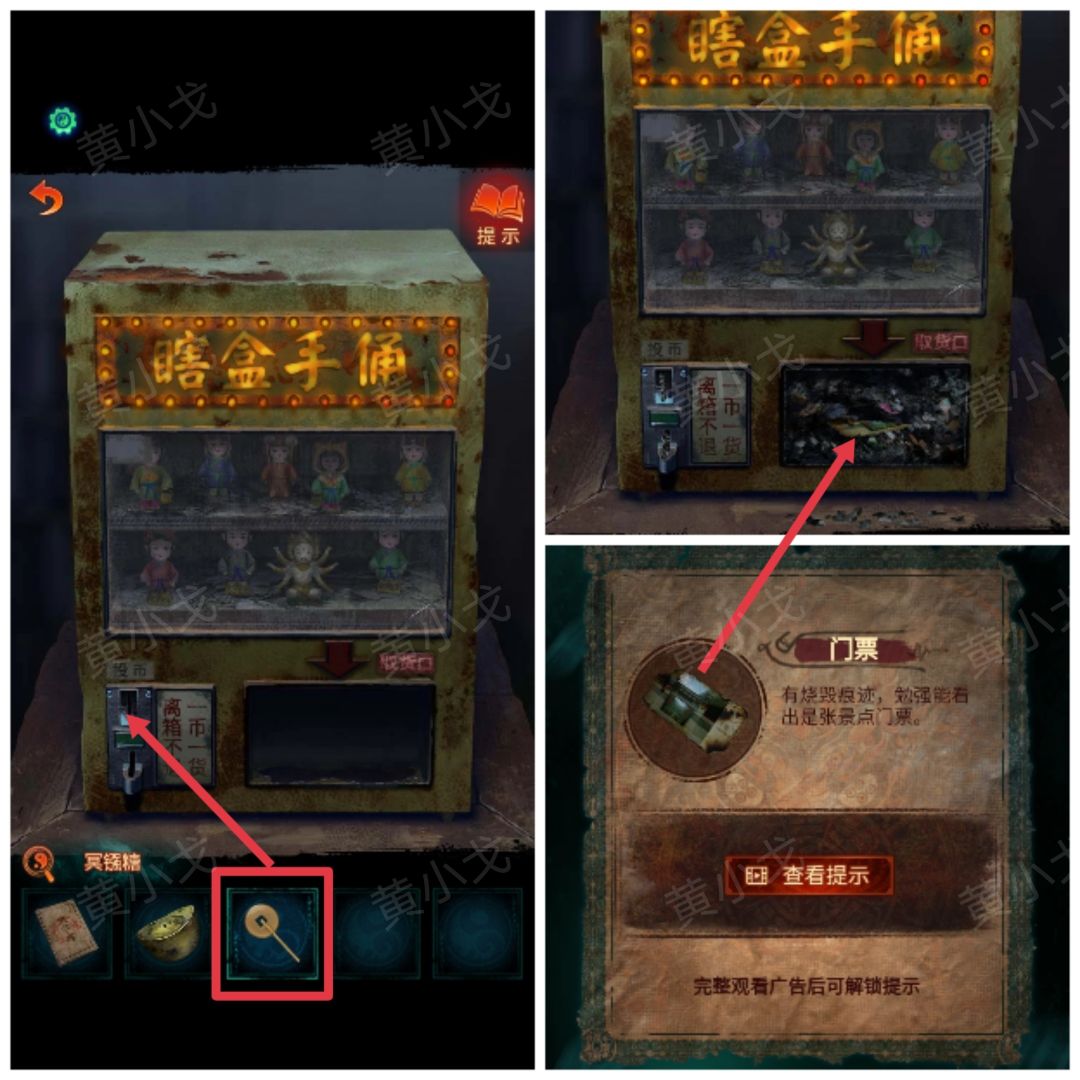 21.(路口)点击瞎盒手佣箱,掰断【冥镪糖】,投入冥镪糖头部;拾取取货口的【门票】