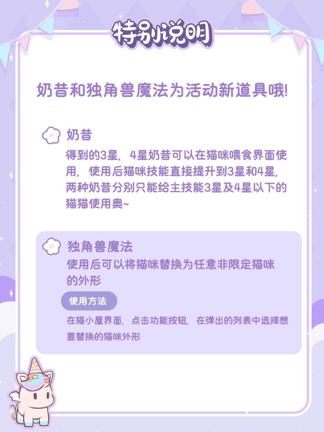 🧁奶昔:获取不同星级的奶昔,可一次性提升猫咪技能(举例 :3星奶昔,使用后猫咪技能可以直接提升至3星)