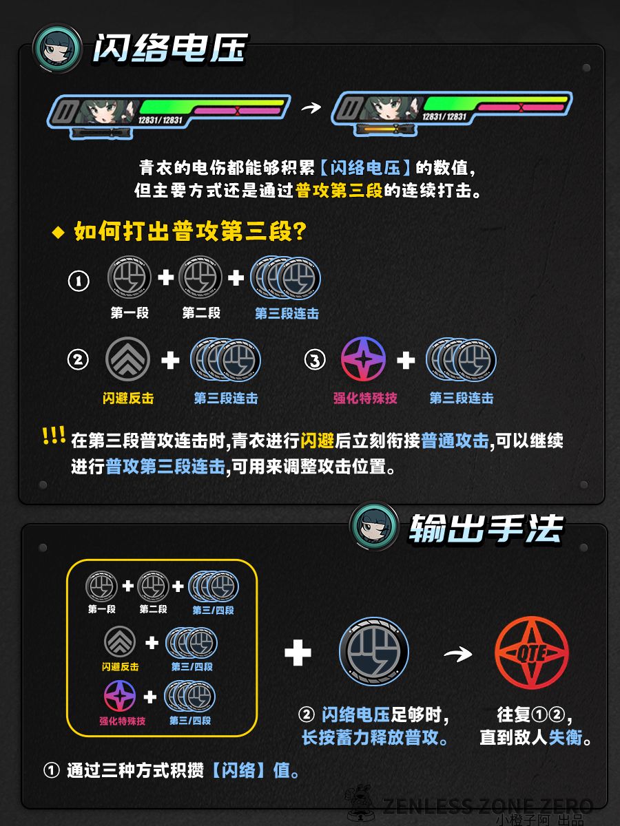 ② 积累方式:青衣造成【电属性】伤害会积累【闪络电压】进度条。——积累主要通过普攻第三段的连打状态搭配强化特殊技、闪避反击、终结技等手段进行积累。