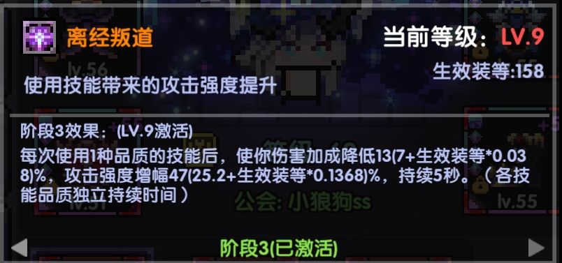 收益:每使用一种品质的技能,使你的伤害降低13%,攻击强度增加47%,持续五秒