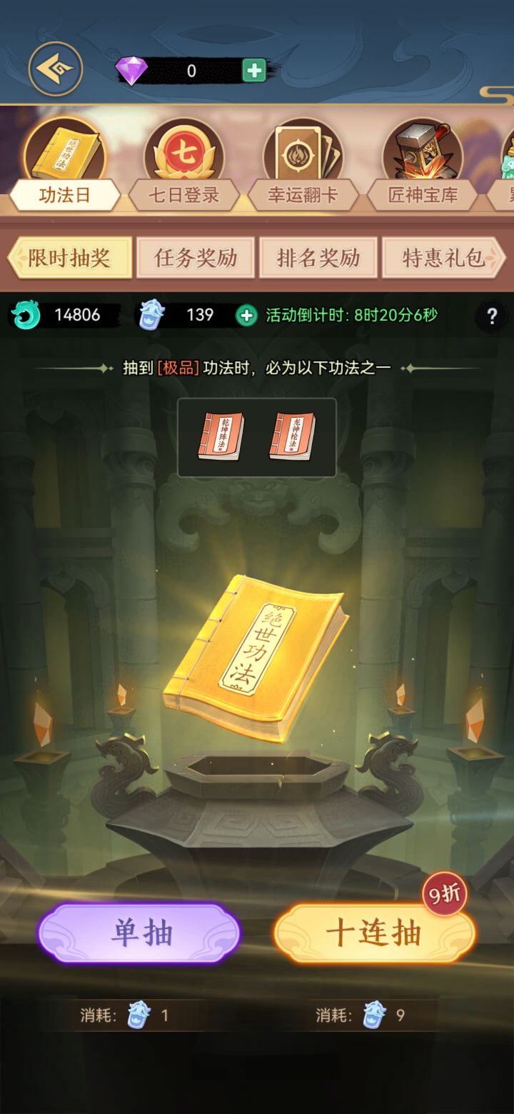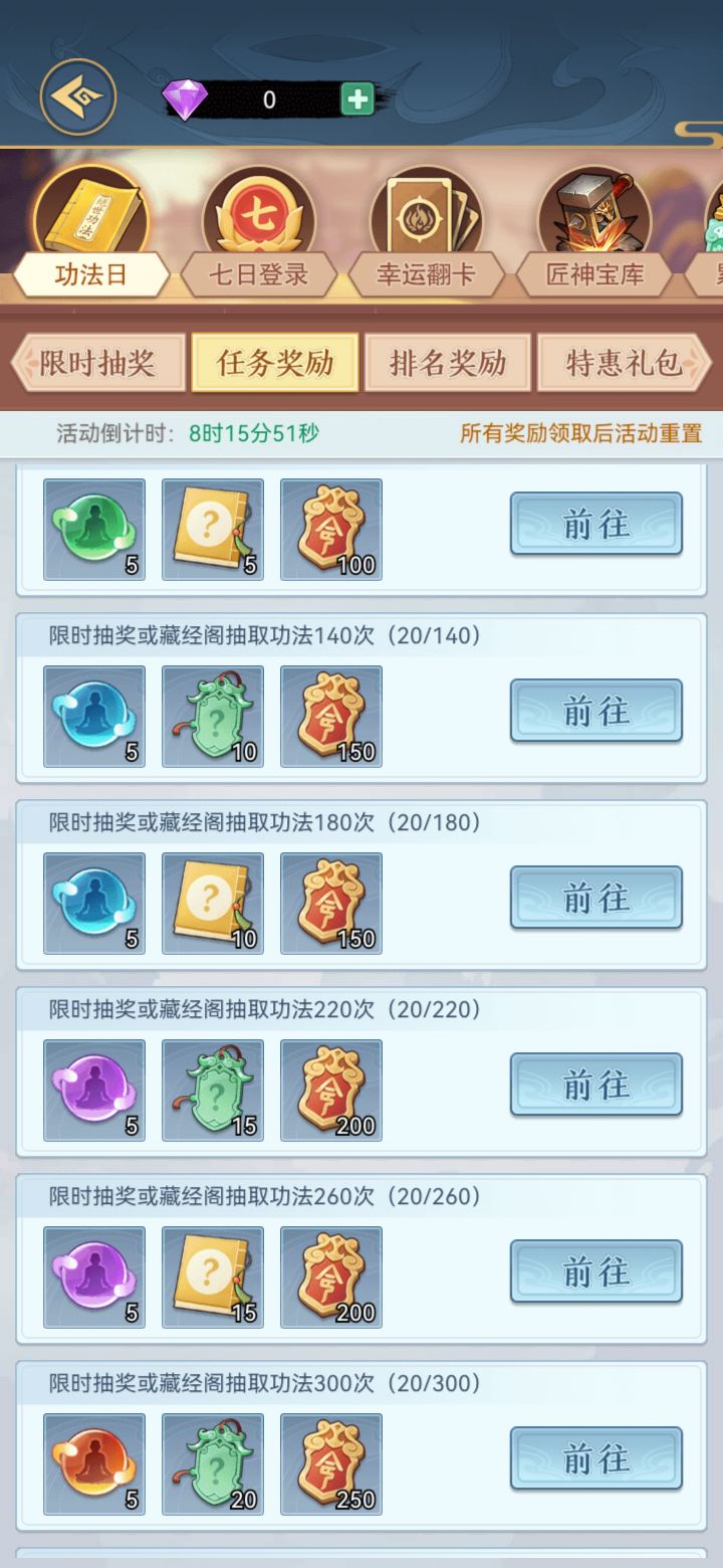 2、第7天开始有固定功法日、法宝日、打造日、灵兽日抽取轮着来。一定要把数量累计满拿奖励,否则不如不抽。见图2
