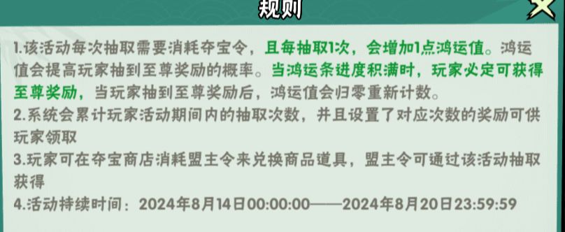 顾名思义,一个“夺宝令”,就是1积分,80积分出保底获得“盟主令”。
