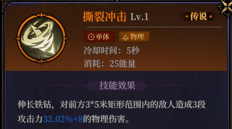 撕裂冲击:物理系的范围伤害法术,有多段攻击伤害,升阶后不仅额外造成伤害,还会增加给敌人上debuff的能力,高阶还能介绍该法术的冷却时间,同时有一定的小范围聚怪能力。