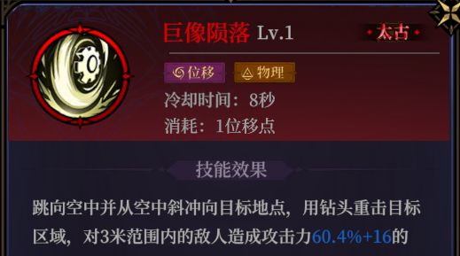巨像陨落:少有的物理系跳跃位移伤害法术,能造成伤害小范围的伤害,升阶后初期牺牲少量伤害换取伤害范围,高阶提升伤害也提升伤害范围,而且增加给敌人上debuff的能力,且高阶概率极高,同时该法术击杀敌人能概率性恢复位移点。