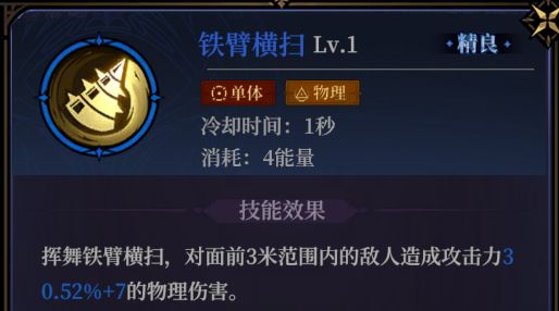 铁臂横扫:物理系的小范围伤害法术,升阶后不仅能额外造成伤害,还能增加给敌人上debuff的能力,高阶还能增加其他debuff,而且冷却时间极端,置于心得槽可以做到无缝衔接。
