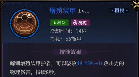 增殖装甲:物理系的持续性护盾法术,吸收防护物理伤害,升阶后不仅能增加自身的攻击恢复能力,还能提升护盾总效果,极致的增加生存能力。