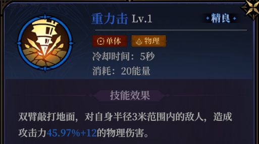 重力击:物理系的小范围伤害法术,升阶后不仅能增加给敌人上debuff的能力,而且概率较高,还能减少冷却时间,同时高阶能额外增加debuff;关键冷却时间很短,高阶还能减少冷却时间的效果,也可以放置于心得槽使用。