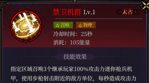 禁卫机群:物理系的召唤单位伤害法术,升阶后不仅增加机兵的攻击频率,还能额外对敌人造成伤害,持续时间较长但相应的冷却时间也略长。