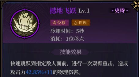 撼地飞跃:少见的物理系跳跃位移伤害法术,在位移过程中造成伤害,升阶后不仅额外造成小范围伤害,同时还能增加给敌人上debuff的能力,并且也会提升法术伤害效果,高阶还会给自身施加额外buff,而且冷却时间很短。