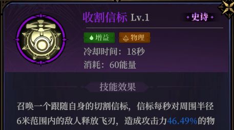 收割信标:物理系的持续性召唤物范围伤害法术,持续时间长且伤害范围较大,升阶后增加给敌人上标记BUFF(满层后随机产生不同debuff)的能力,而且还有较高概率可以施加物理系debuff的能力,冷却时间较长。
