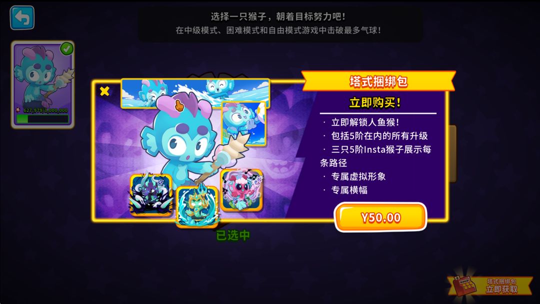 同时,针对这三个猴塔也将额外推出可选的付费解锁礼包,包含猴塔解锁、5级及以内的所有升级解锁、每个路径的5阶Insta猴(5xx、x5x 和 xx5)、专属横幅及头像等内容;