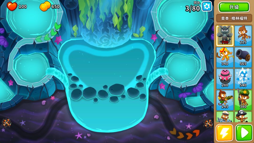 ——上路人鱼猴会与神秘的海洋生物并肩作战!海洋生物向各个方向攻击,用墨色三叉戟减缓气球速度,并提高半径内所有猴塔的穿透力!