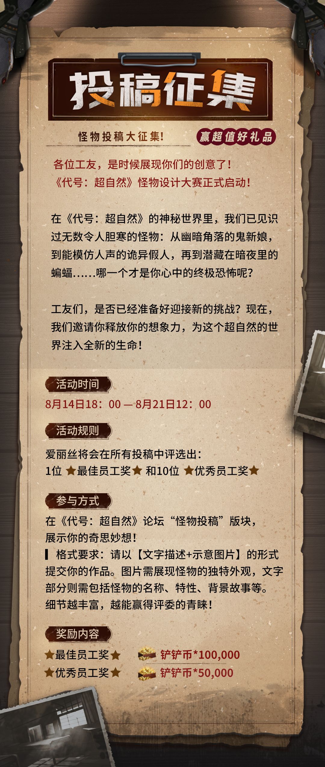 在《代号:超自然》论坛【怪物投稿】版块,展示你的奇思妙想!无论是汲取自《山海经》等古老传说,还是民间流传的奇异志怪,亦或是你心中独一无二的鬼魅魍魉,我们对每一种创意都报以热烈的欢迎和无限的期待!