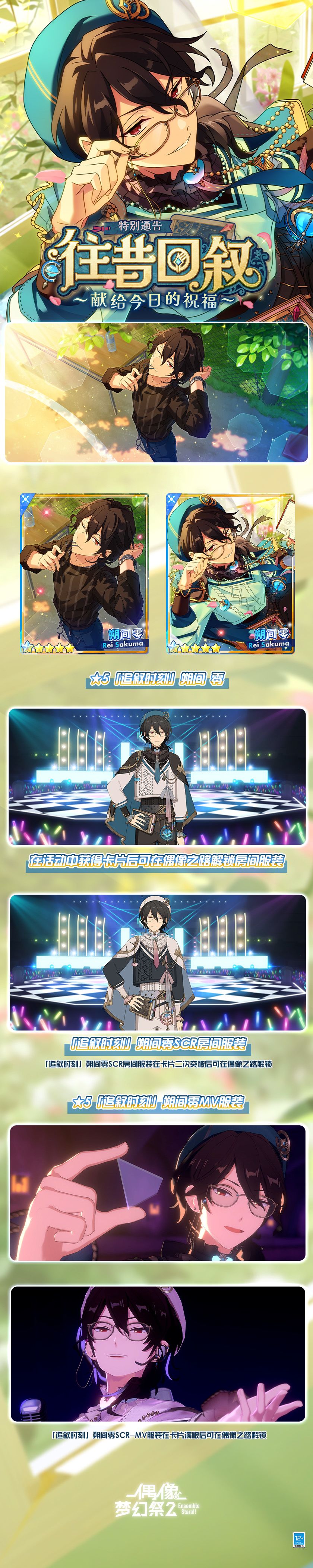 活动期间,游戏内将免费公开【特别通告 · 往昔回叙】中所登场的偶像「朔间零」的相关联活动故事 ——「分歧点*憧憬的模样与FLASHBACK」、「招募!瞬息与展览会」、「Origin★歌唱星空的Altered」、「温故知新/继承的御前比武」