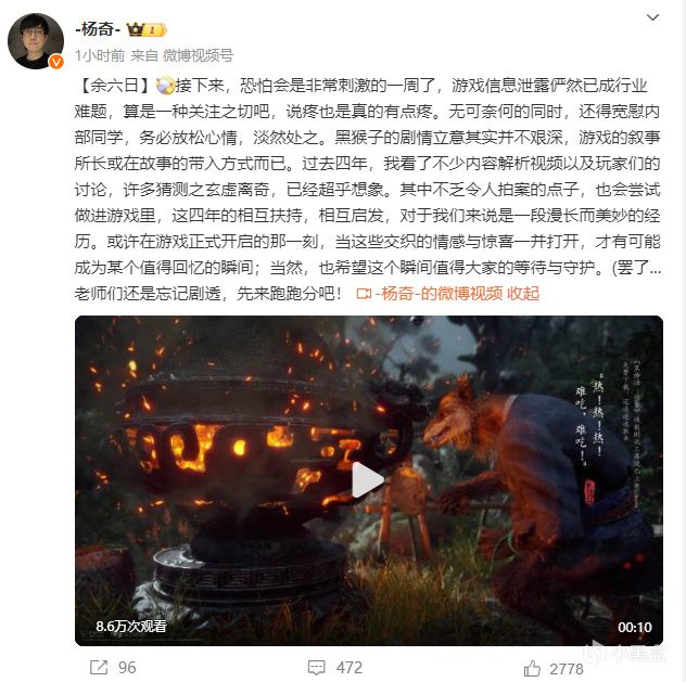 今日《黑神话:悟空》发布了发售倒计时6天的视频,游戏的美术总监杨奇也发布了该视频并谈论了自己的看法: