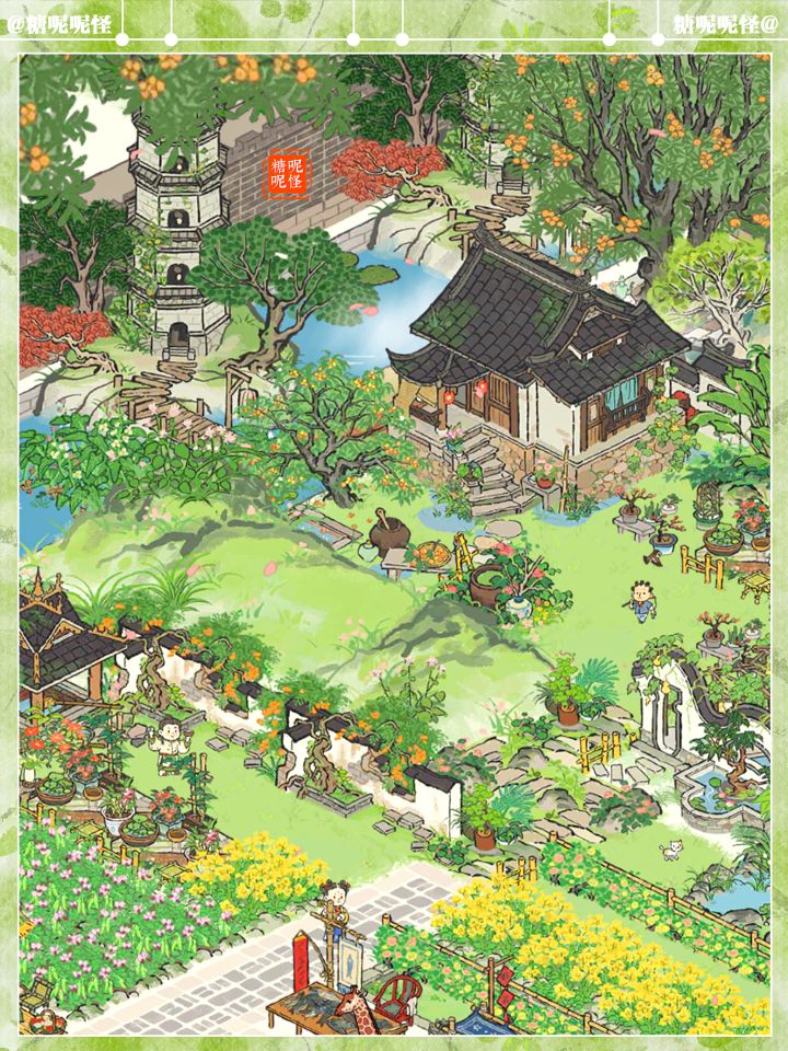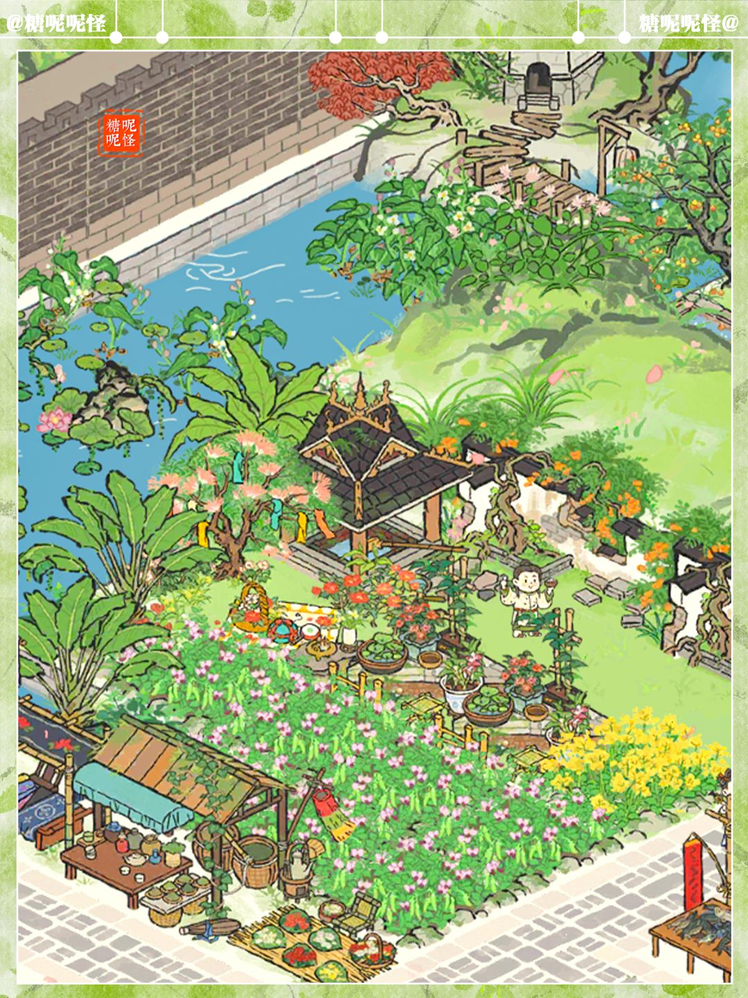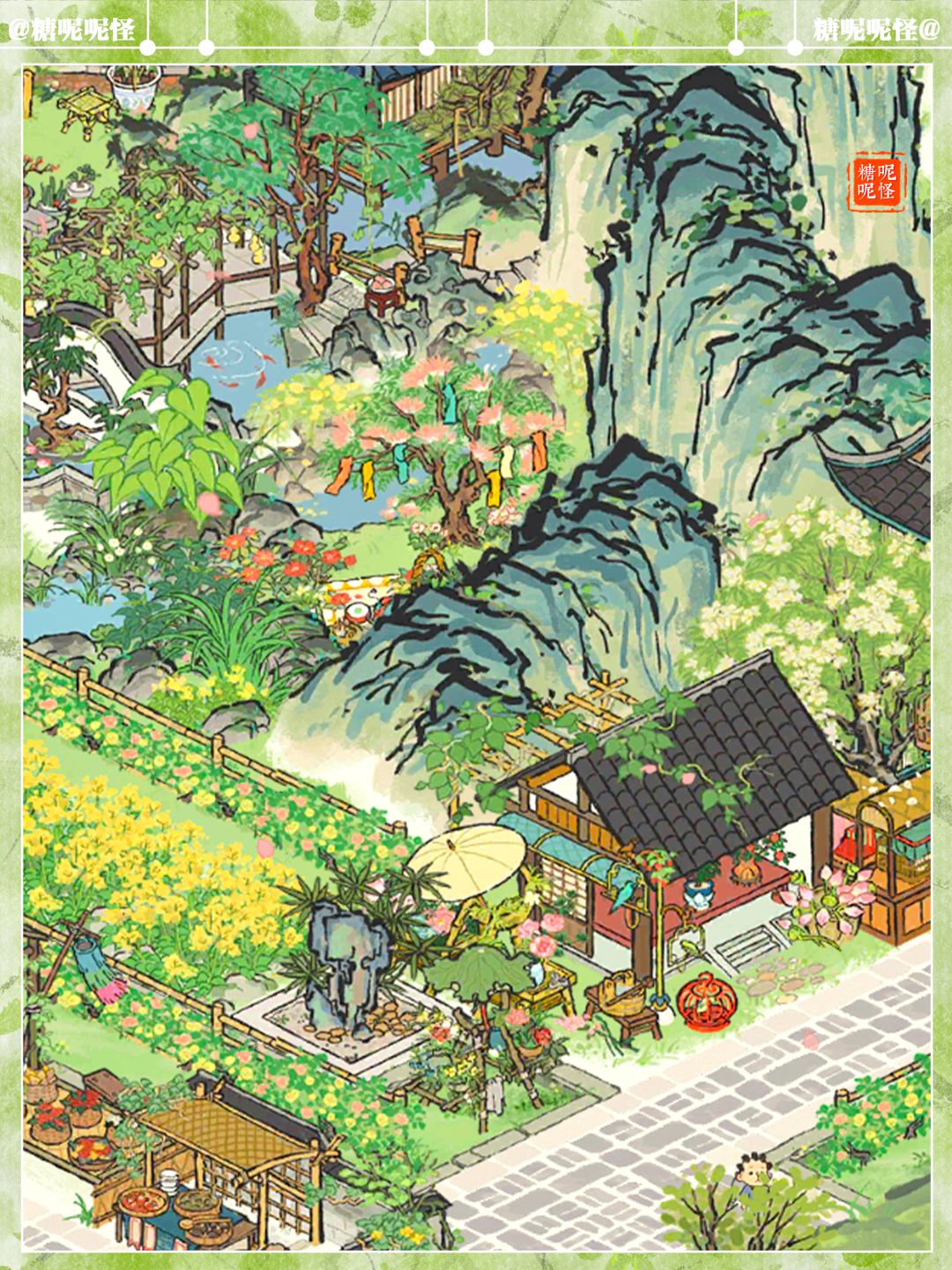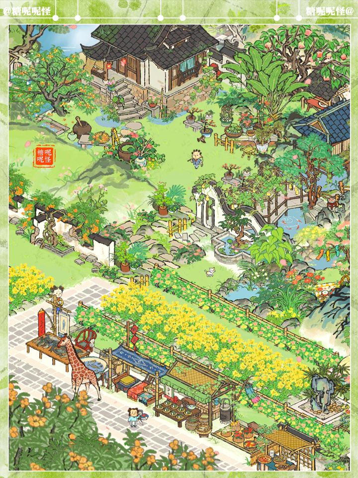 建筑:烟雨熟青梅|吉祥长廊|闲云水榭|一掌山|亭亭枇杷|停云山|伏鹿山|碧水楼台|语莺花市|四方货集|墙花半隐|油菜花田