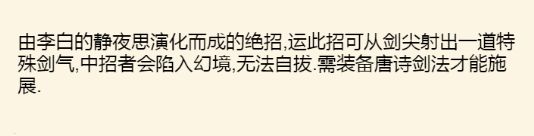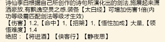 简介:诗仙李白根据自己所创作的诗句所演化出的剑法,施展起来潇洒豪放,有飘逸空灵之感,装备[太白经]可增加伤害1倍(内功等级需匹配剑法等级才生效)。