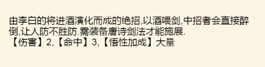 【将进酒】:直伤绝招,伤害一般,命中敌方的同时给敌方添加3层“醉酒”状态。(①“醉酒”效果为敌方命中降低。)