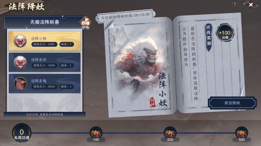 ■增加“法阵降妖”玩法。在本次测试中,世界各处将出现上古法阵地图,各位将军可派遣队伍进入法阵地图中与上古异兽进行战斗,降妖成功后将获得对应的功德点数,每周可根据功德点数来获取大量的额外奖励。