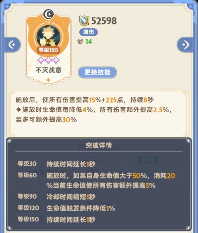 其次,对于剑士正常的输出环境来说,都是会带奶妈的,真焱的每0.5s消耗2%当前生命不会出现断崖式的下跌,同时奶也会持续给奶量,理想状态的扣血越多增伤越高其实是非常不稳定的,因为全自动的情况下,你无法控制你的【不灭战意】刚好在血线最低的时候释放。同时,你自己扣血的大头根本不在于真焱扣血,而在于【不灭战意】的60级解锁效果。如下图。