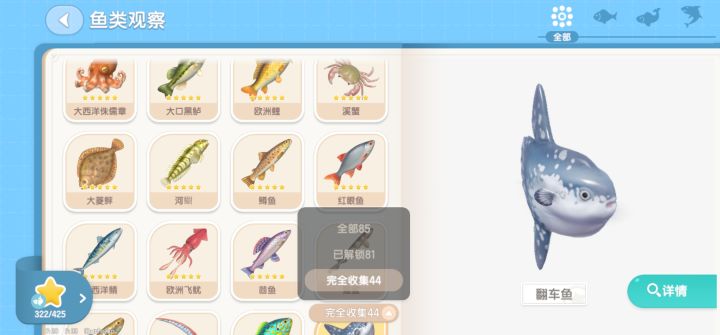 本人目前钓鱼10级,全图鉴85共解锁81,未解锁图鉴为10级三彩虹鱼与潮流季未开放鱼,完全解锁图鉴44条。