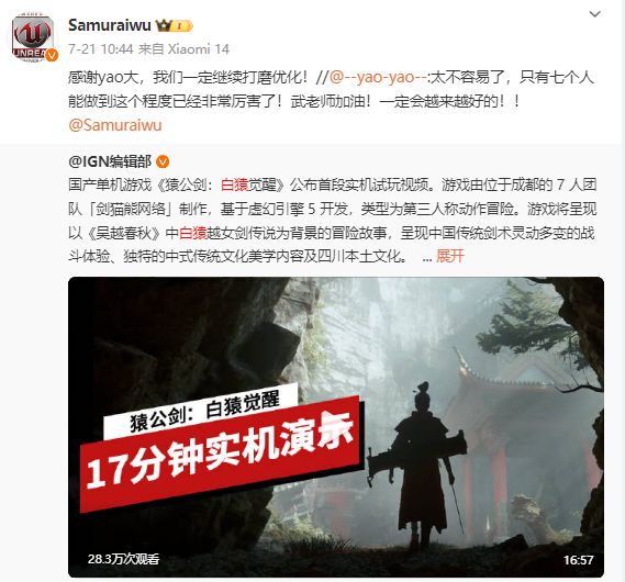 目前猿公剑在IGN发布的视频播放量已超百万,这远超团队预期。但同时,团队也在视频评论区得到不少负面评价,主要集中于视频开头的四川竹琴片段太长、女主角色建模不精致、听不懂四川方言、画质不清晰、玩法不清楚。