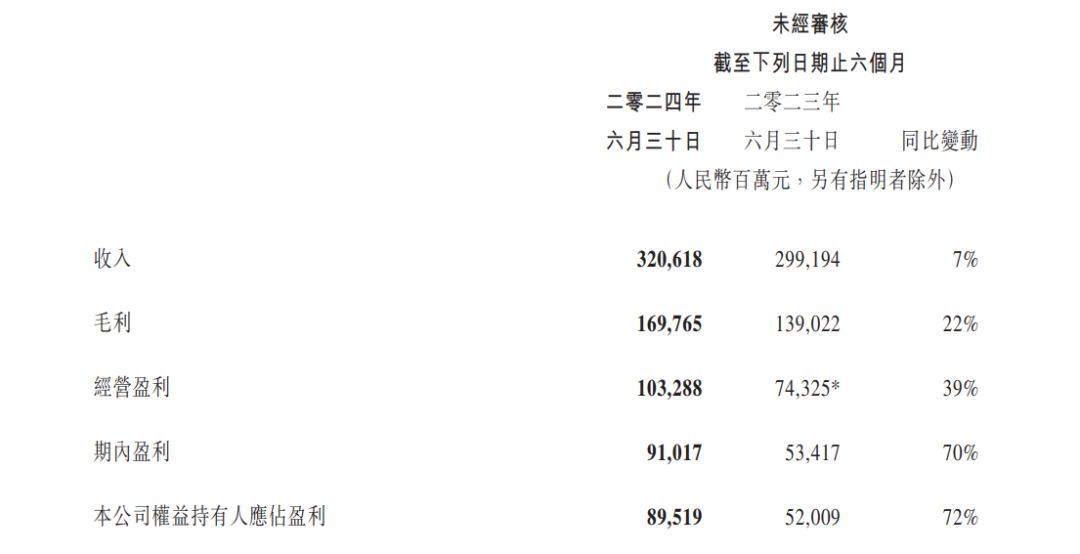 财报显示,腾讯2024上半年总营收约为3206亿元,同比增长7%;公司权益持有人应占盈利约895亿元,同比大幅增长72%。其中,Q2营收总额约为1611亿元,同比增长8%;公司权益持有人应占盈利约476亿元,同比大增82%。