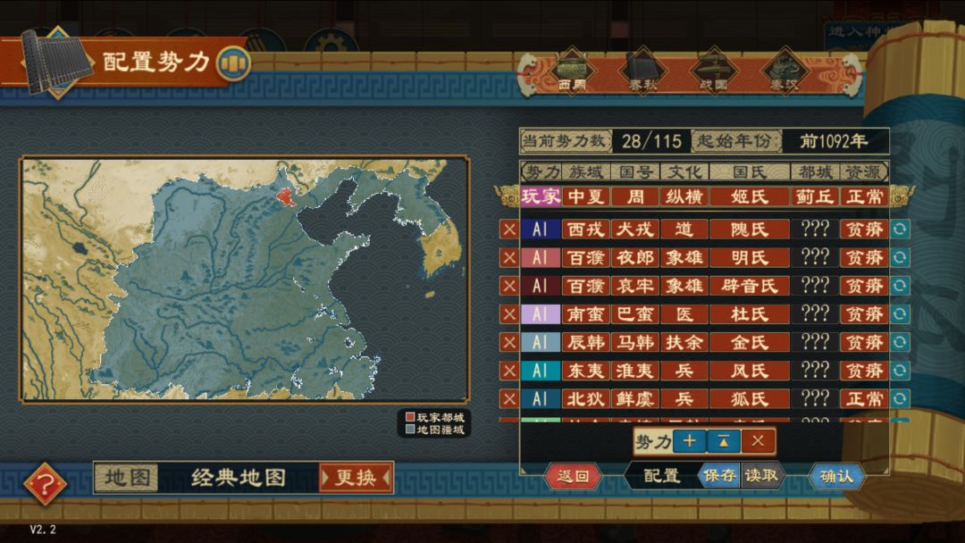 可对每一个势力的颜色、族域、国号、文化、国氏、都城位置、初始资源进行详细配置。