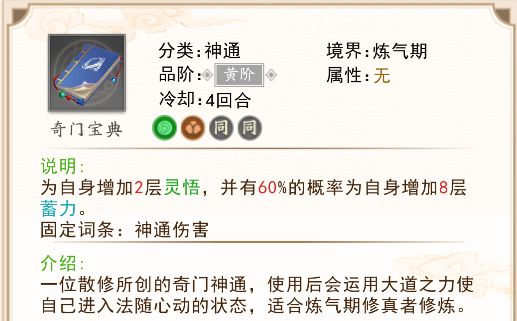 奇门宝典:增加灵悟层数,有概率增加蓄力层数。