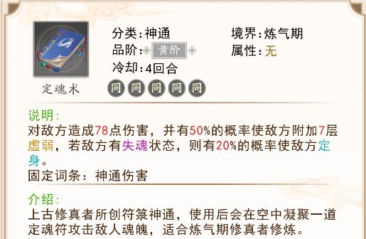 定魂术:对敌方造成伤害,有概率附加虚弱,若敌方有失魂状态,则有概率附加定身效果。