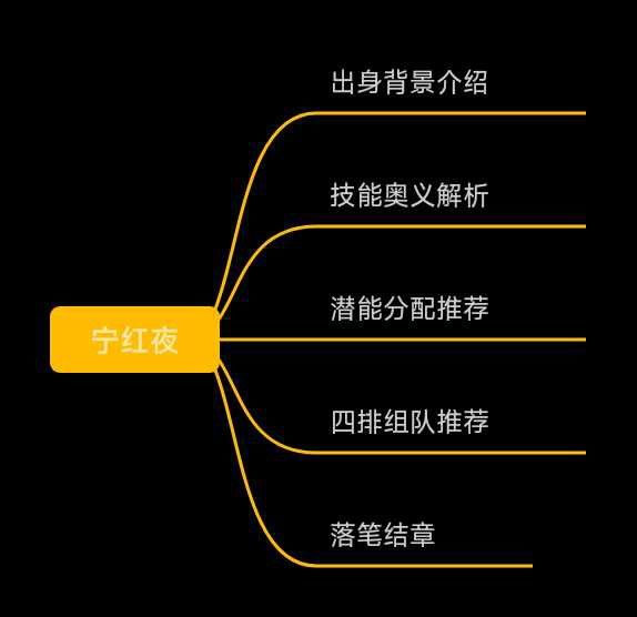 本篇攻略主要针对《永劫无间》中“宁红夜”这个角色展开攻略讲解,而文章也将围绕着“出身背景介绍”,“技能奥义解析”,“潜能分配推荐”,“四排组队推荐”这四个章段进行攻略解析,并在文章最后会针对宁红夜这个角色的上手打法给出个人的主观见解进行收尾。本攻略篇章除官方权威客观内容外,其余均为个人主观见解!!如有异处,欢迎指出批评!针对多维度攻略,笔者将以目录排版的形式供玩家直观参考,如对排版形式摈斥,可参鉴下方思维导图: