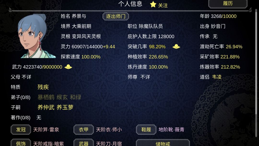 又一个小小的幸运降临在这个小门派。天机851年,暴栖鹤,一个土天灵根的弟子被养金鱼发现,并且成功收到了自己的门下,不过这也是另一个悲剧的开端。