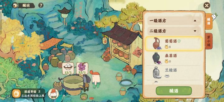 葡萄树是换来的,一下子20棵种下去,收葡萄还得一棵棵点过去有点麻烦,而且用得不多吧,一会儿葡萄又结满了也没啥意义啊?酿酒一周也就这么点经验限额,酒曲留着做其他酒算了,早知道换几棵树就够了