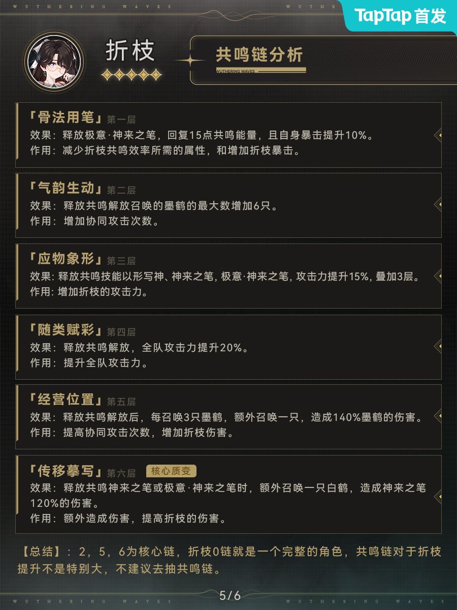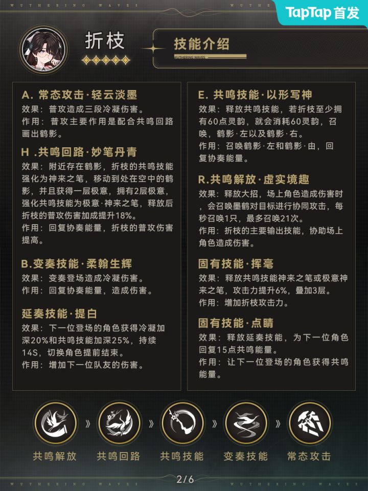 折枝是一个拥有快速协奏和协同攻击且有冷凝和共鸣技能增伤的副C角色,共鸣回路拥有特殊的灵韵可以消耗灵韵召唤鹤影,使共鸣技能获得特殊的强化打出瞬移的效果,释放大招拥有高频率的协同攻击。