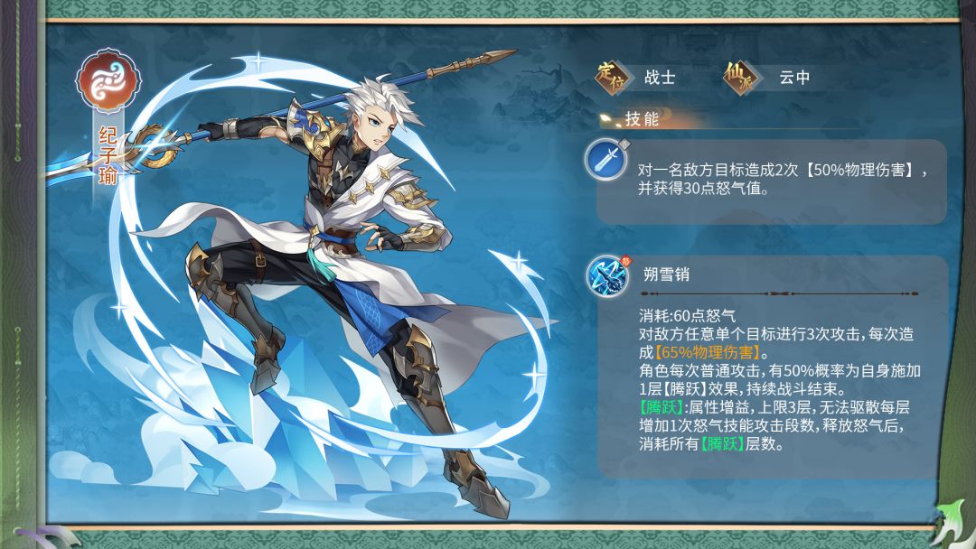 纪子瑜的定位是水属性的战士,来自于仙派云中。