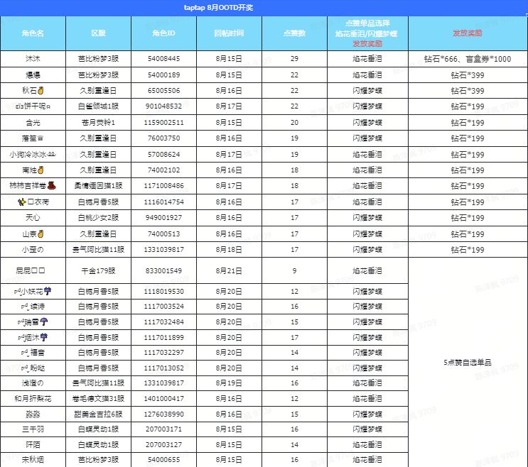 点赞超过5个玩家:8月限定专属单品*1 或 返场饰品*1(一定要备注要哪款哦)