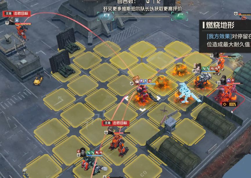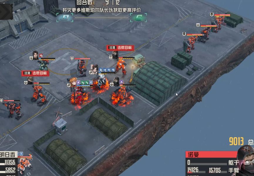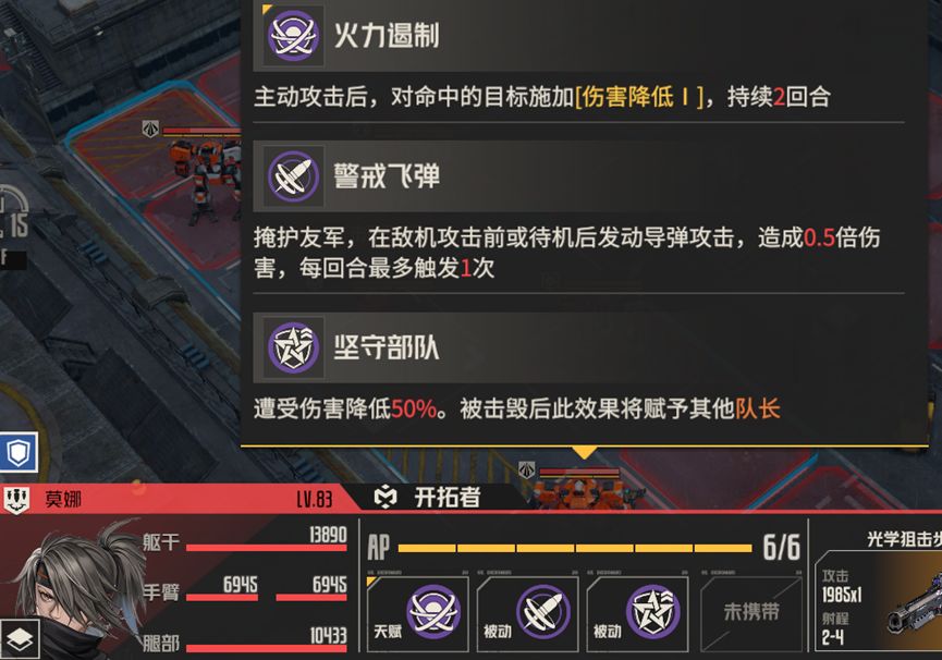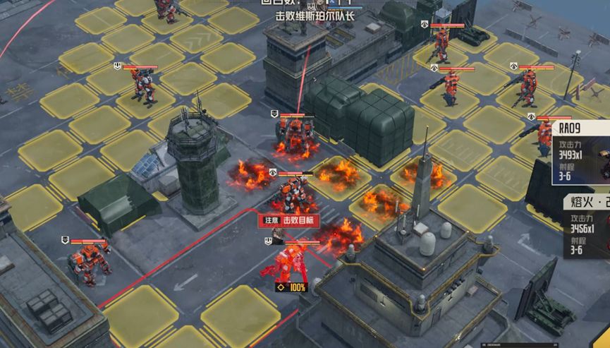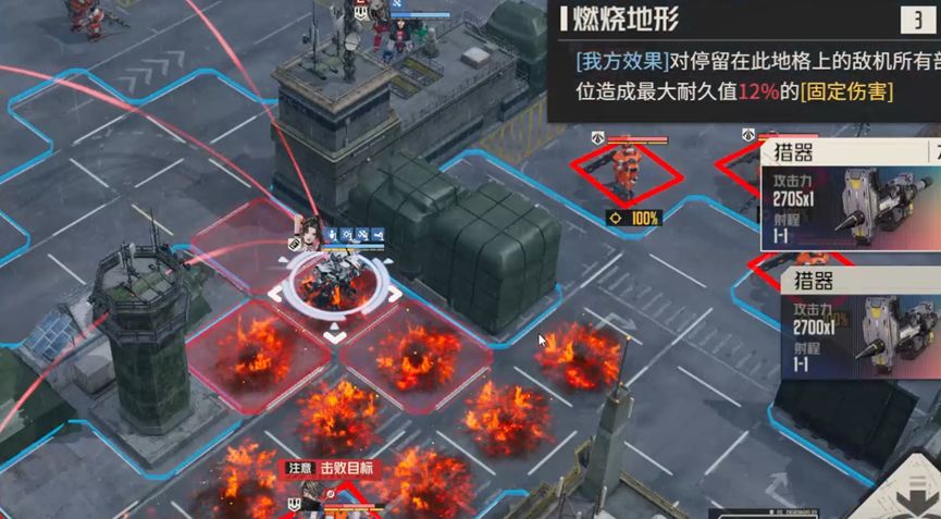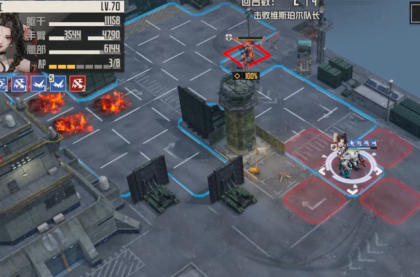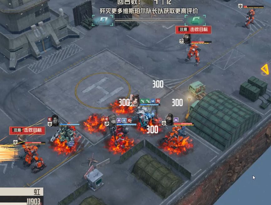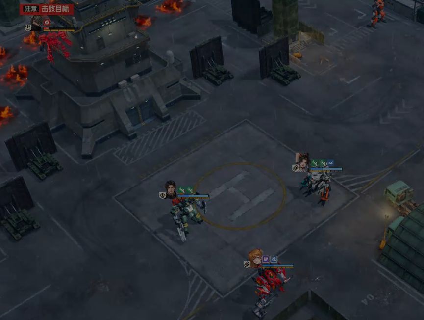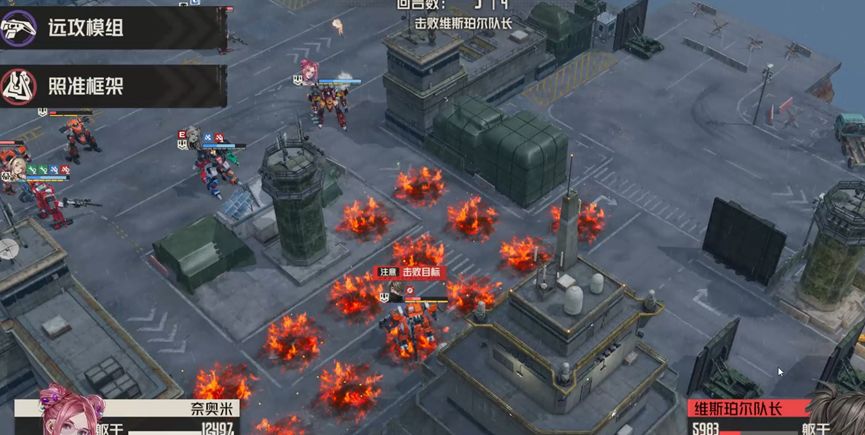 不消灭精英队长,直接攻击boss诺曼。精英队长伤害中规中矩,如果不消灭他们,就需要让他们失去攻击能力,这里笔者采用的是将远离boss的两个队长引开,靠近boss的两个断手,这样我方其他机师就可以专注攻击boss,而不会受到四个队长的攻击威胁。对于boss的处理,笔者采用单次伤害的锁头攻击和燃烧石墨固伤,最大化减轻自旋带来的副作用,确保生存。