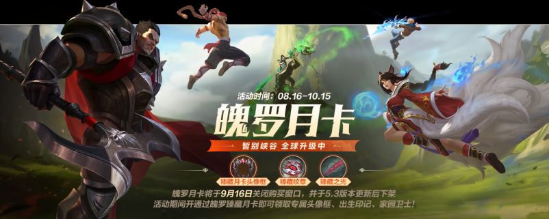 魄罗月卡暂别峡谷,全球升级中!魄罗月卡将于9月16日关闭购买窗口,并于5.3版本更新后下架。已邀活月卡召唤师仍可在有效期内正常领奖、享受特权。除此之外,8月16日(明日)至10月15日活动期间,开通过臻藏月卡的召唤师可领取臻藏月卡专属头像框、出生印记、家园卫士好礼~
