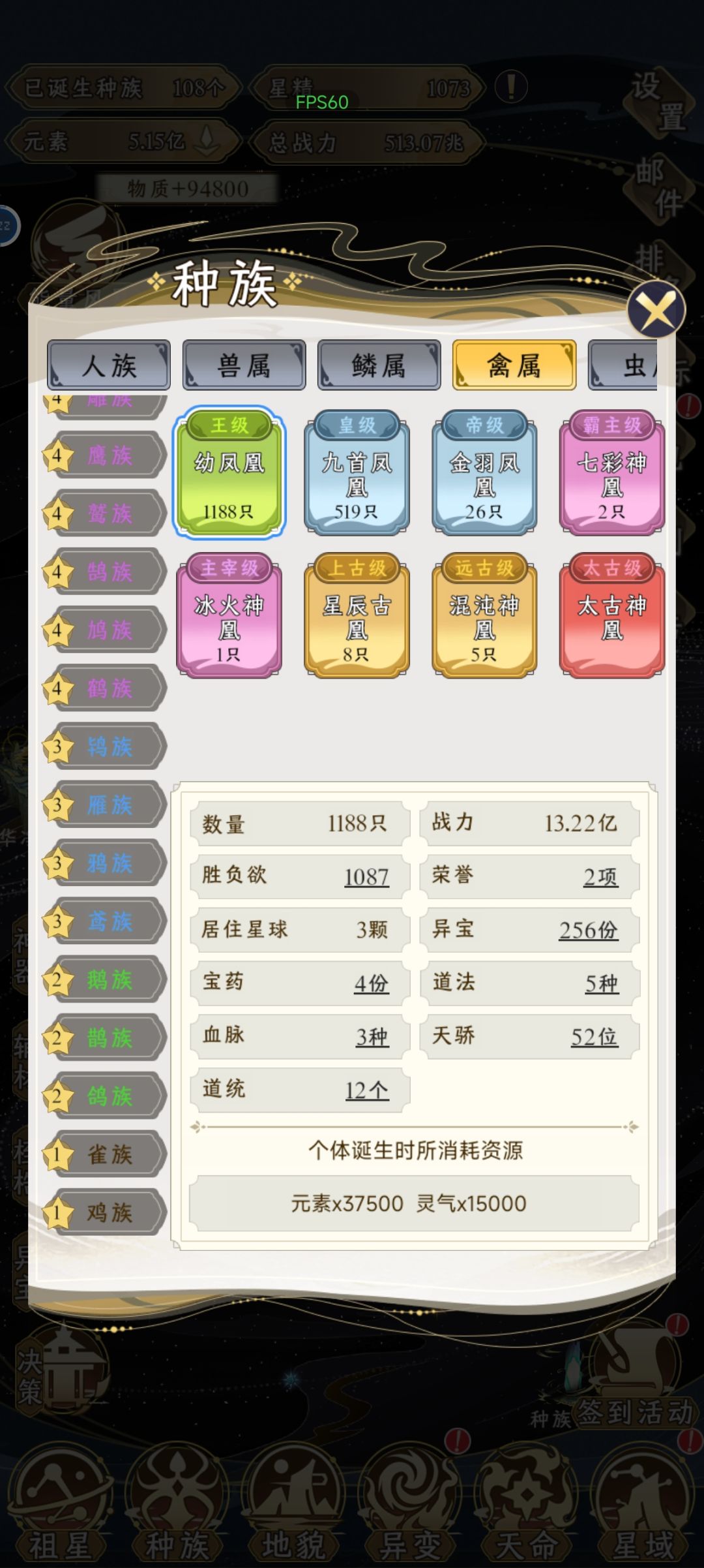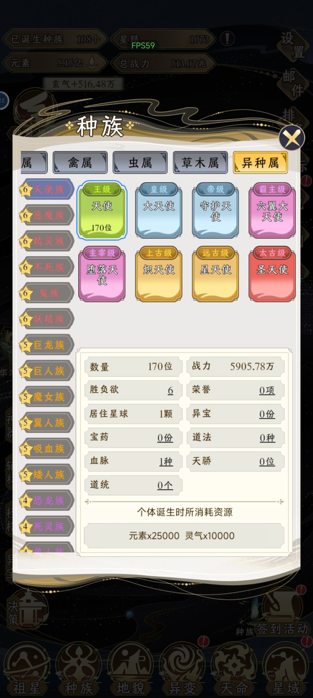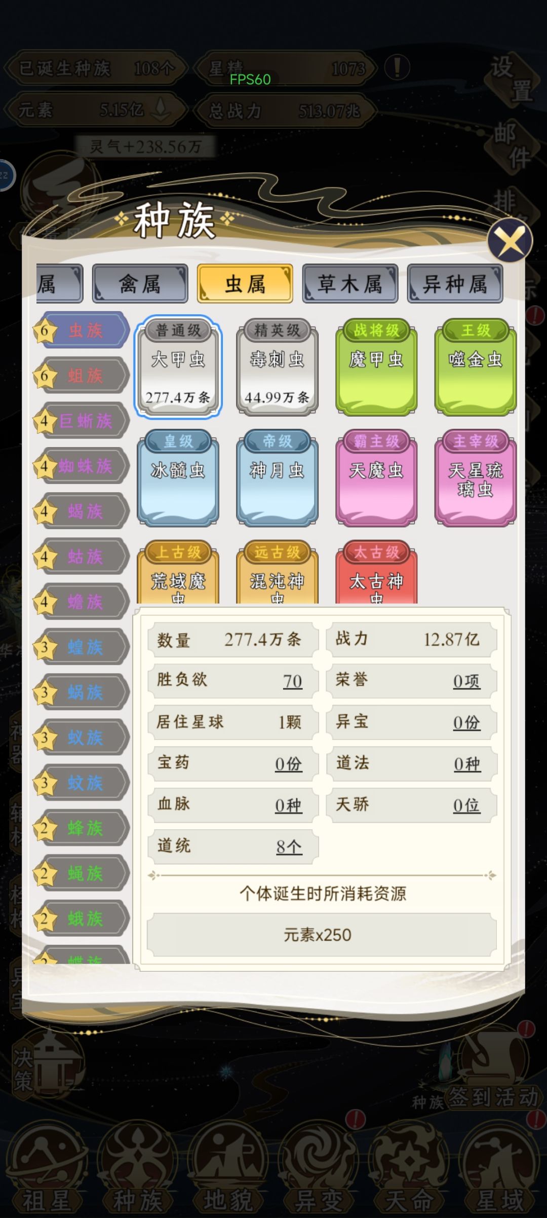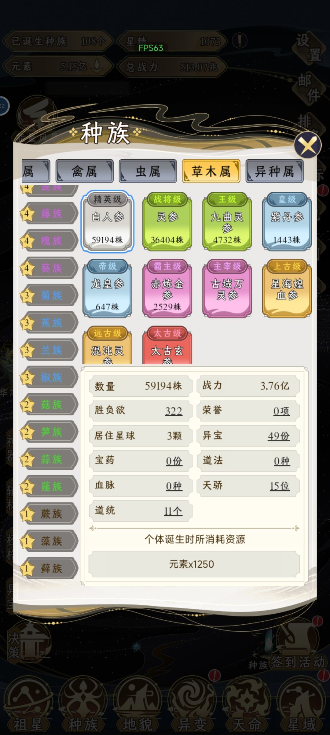 把地貌部分升级完了,一共是108个种族。除了异种属是6个红色等级,其他属各2个。人族就只有人族自己。详情见图。