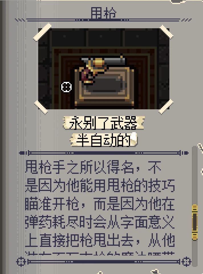 枪手在子弹射光后,会投掷出自己手上的枪械。这把手枪此刻就是子弹本身!这也是除了机器人(生命劣势)和子弹人(渎神剑)的初始武器外,最强的初始武器了。
