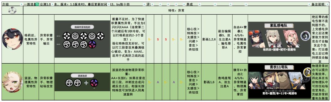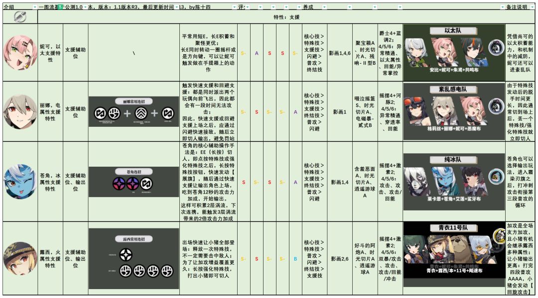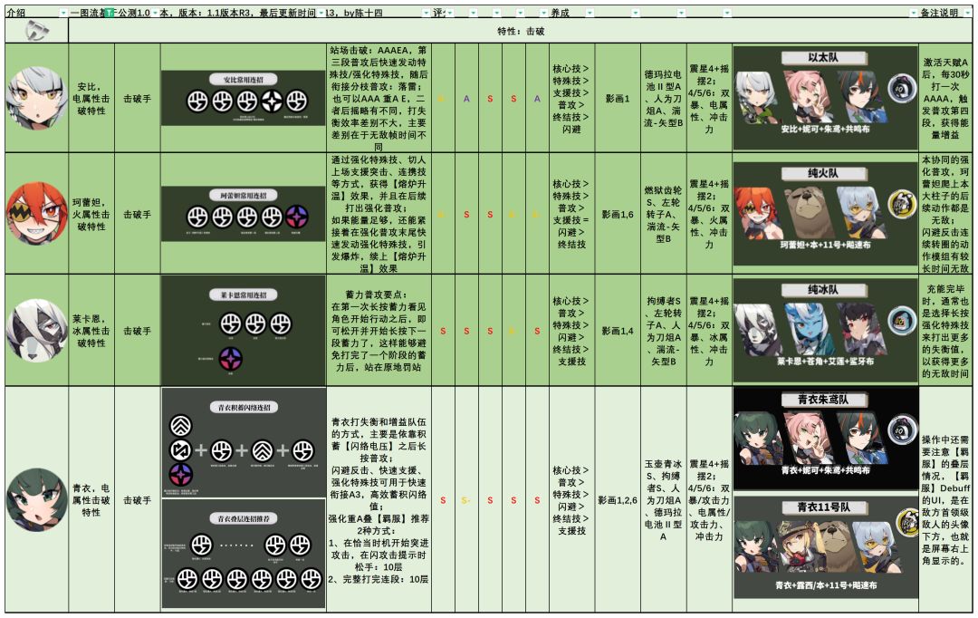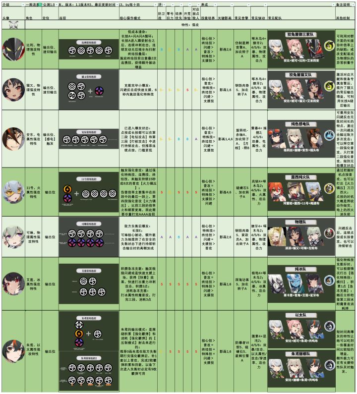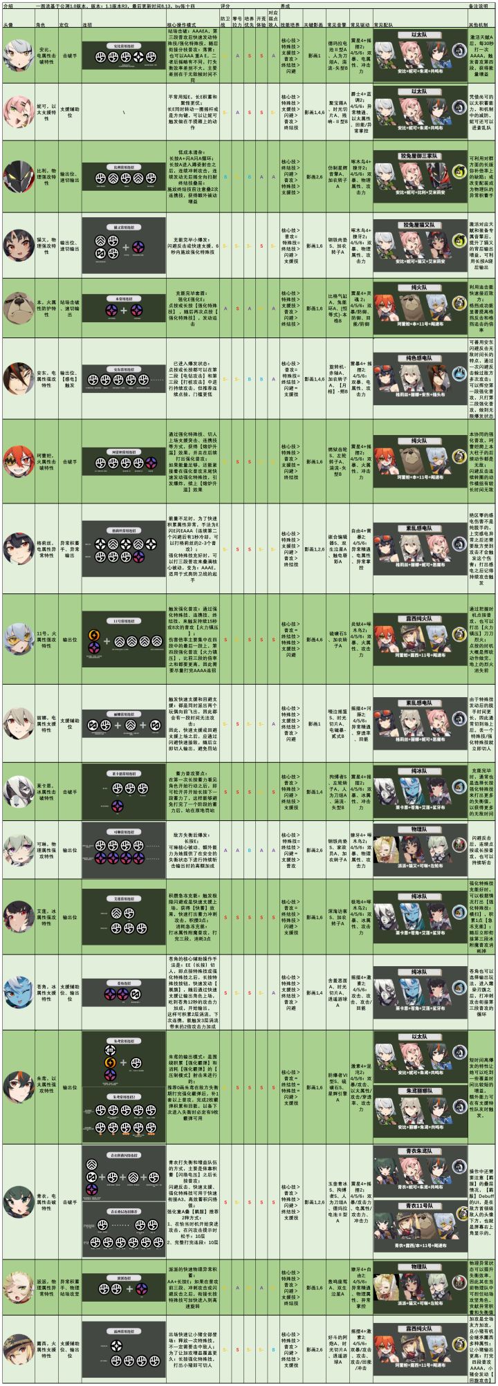 这个版本的【全角色速通一图流】有几个特点:1、信息高密度,方便绳匠们快速了解到角色的【连招】、【核心操作模式】、【强势劣势区间】、【技能培养优先级】、【关键影画】、【常见配装】、【常见配队】。