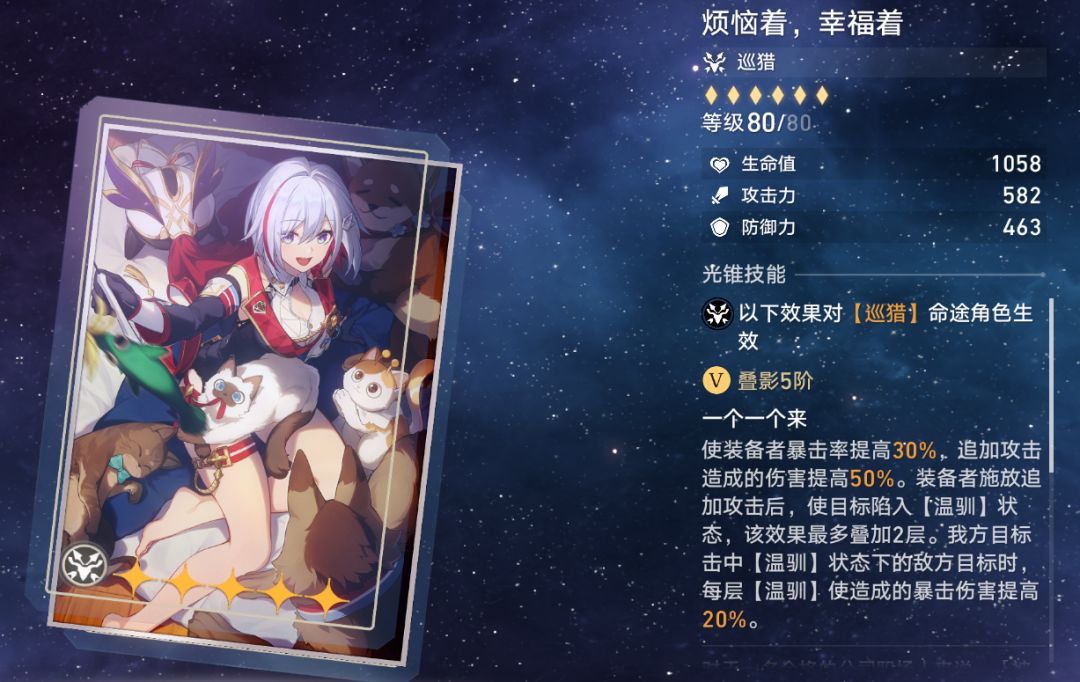 作为超击破队大核流萤的专光,所围绕的词条也十分契合击破,不仅提供大量的击破特攻,而且还能提供宝贵的超击破增伤,同时受击目标的速度降低debuff还能让整个队伍打出更高频率的超击破伤害,是专光中的佼佼者。