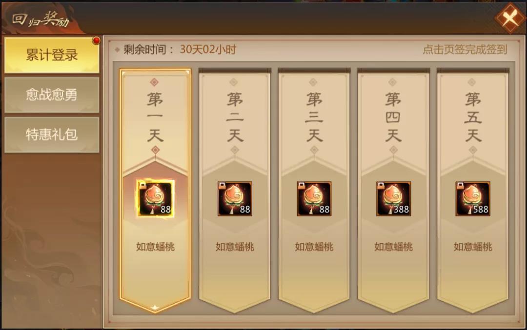 累计登录部分顾名思义,只要大家连续登录5天,就可以在活动中领取对应的奖励,这次梦梦为大家准备了大量的蟠桃,只要登录游戏就可以获取,全部免费哦~