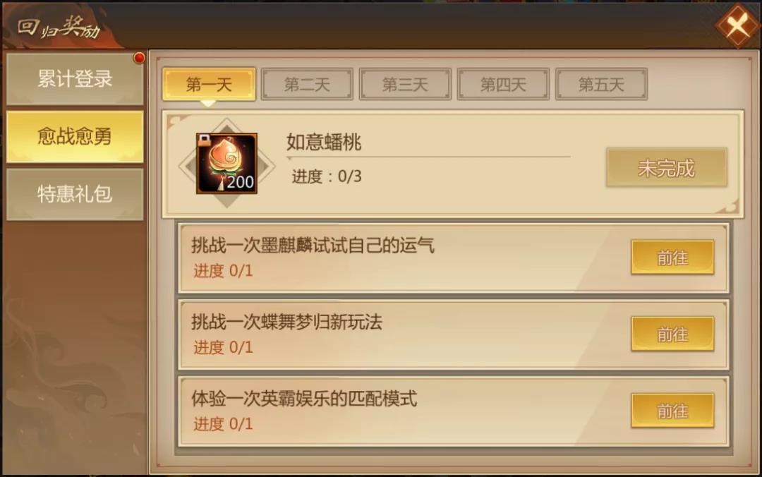 在愈战愈勇中,梦梦为大家准备了连续5天的任务,这些任务难度都不高,大家只要每天上线完成任务,就能领取大量的如意蟠桃。