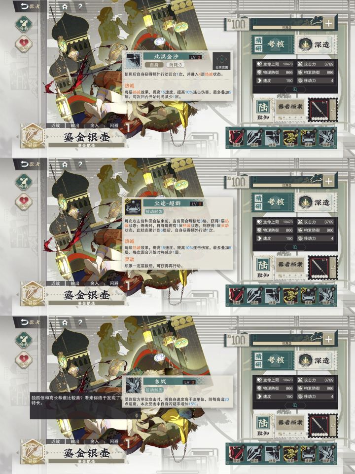 首先是这套打法的核心器者:金卡鎏金银壶;特点是高速、灵活、闪避高,深造建议点贯穿0505(0604)