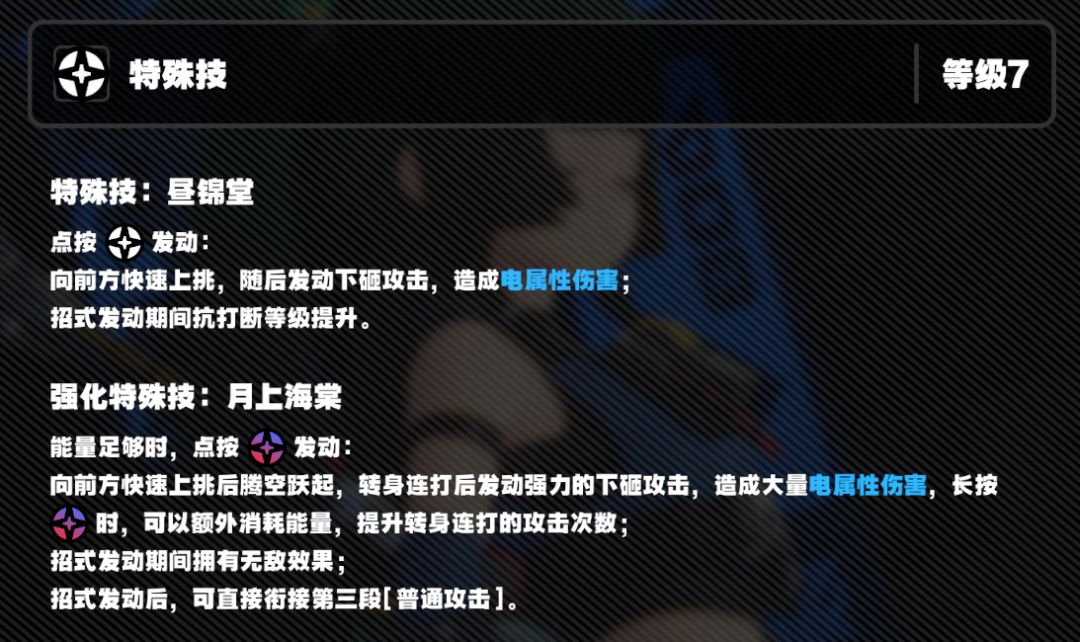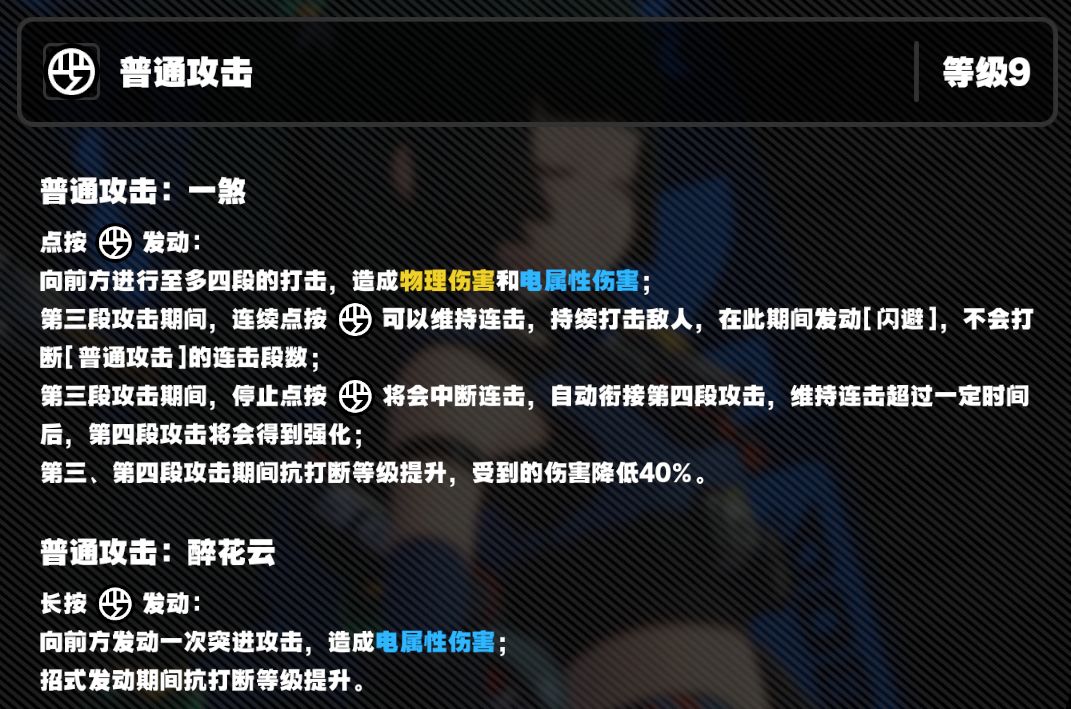 简单介绍:电属性击破,偏向站场的击破角色,攻击方式是近战。普通攻击的闪电五连鞭手感不错并且打失衡也很快。