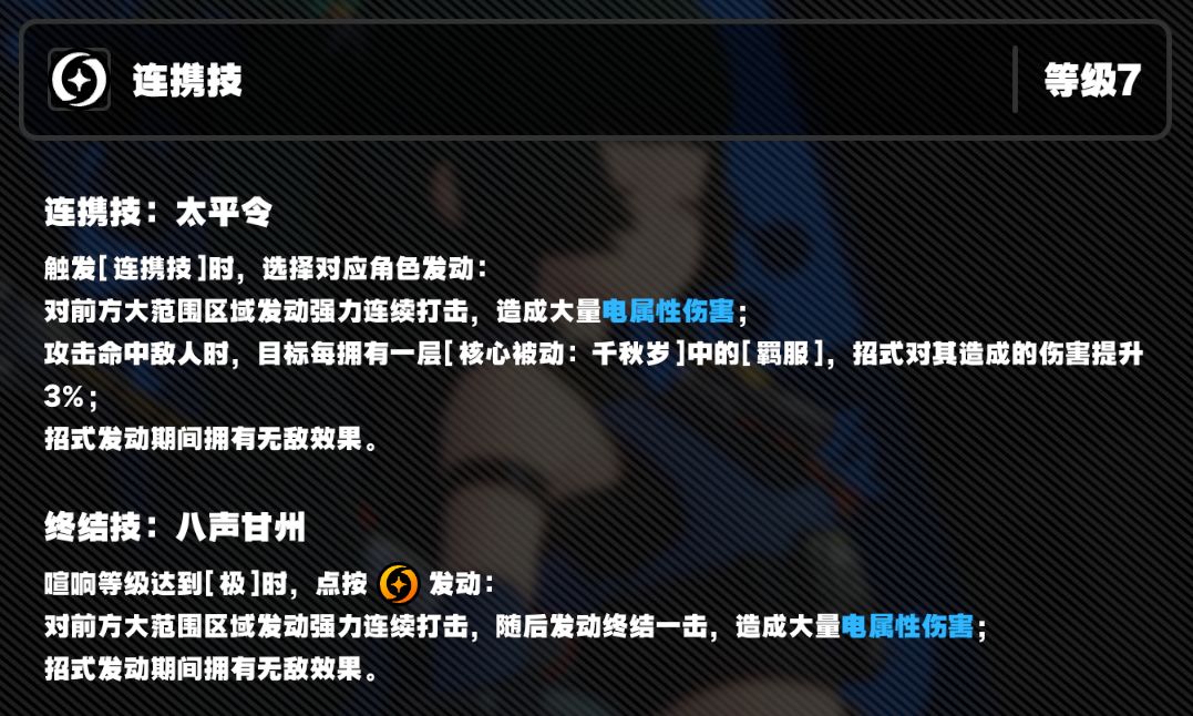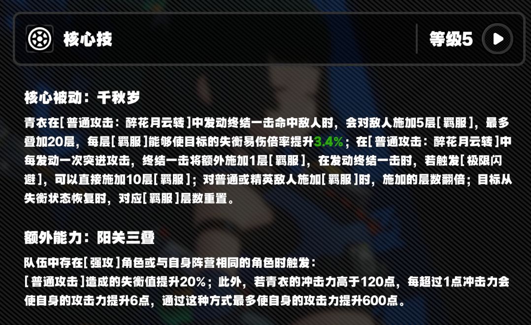 2:[核心被动:干秋岁]中每层[羁服]提供的失衡易伤倍率提升效果提升至原本的135%;青衣攻击命中敌人时,若对其施加的[羁服]已叠加至层数上限,则自身对其造成的失衡值提升15%。