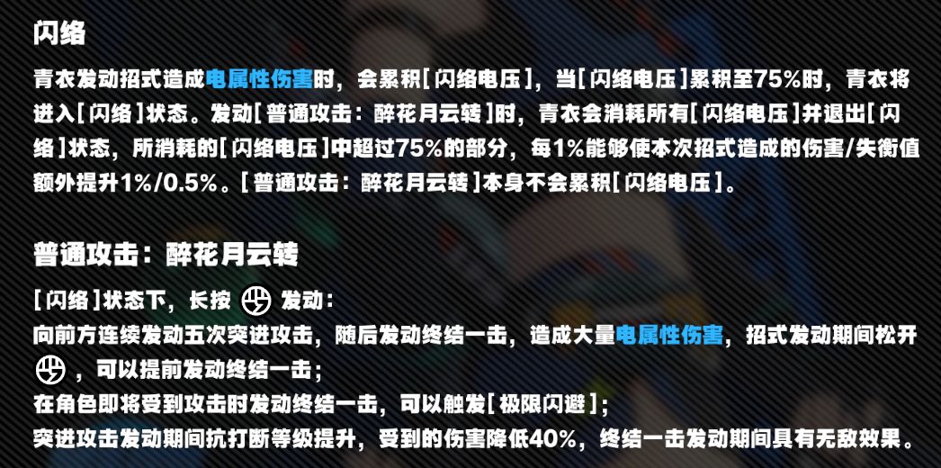 1:青衣进入战场时,立即使[闪络电压]回复至上限,并使其后继累积效率提升30%;发动[普通攻击:醉花月云转]时,若[闪络电压]已累积至上限,则使本次招式命中的敌人防御力降低15%,且自身对该目标的暴击率提升20%,持续15秒。