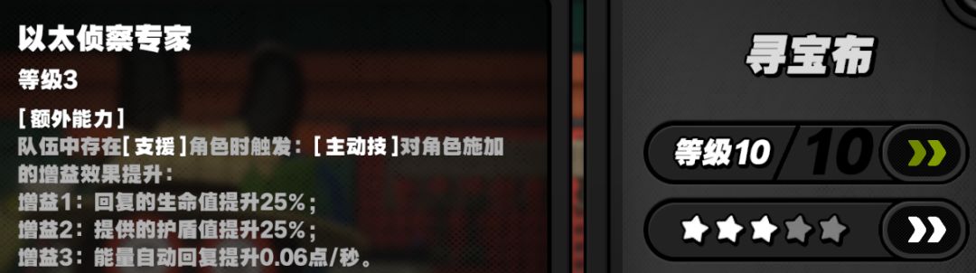 额外能力:队伍中存在2名或以上[以太属性]角色时触发:[邦布连携技]累积的属性异常积蓄值提升100%。