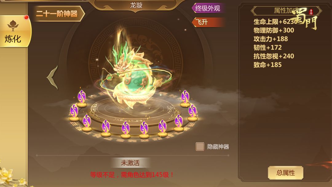 同时也开放21阶神器【龙璇】,金龙缠碧玉,神气无比!角色等级达到145级即可激活养成!